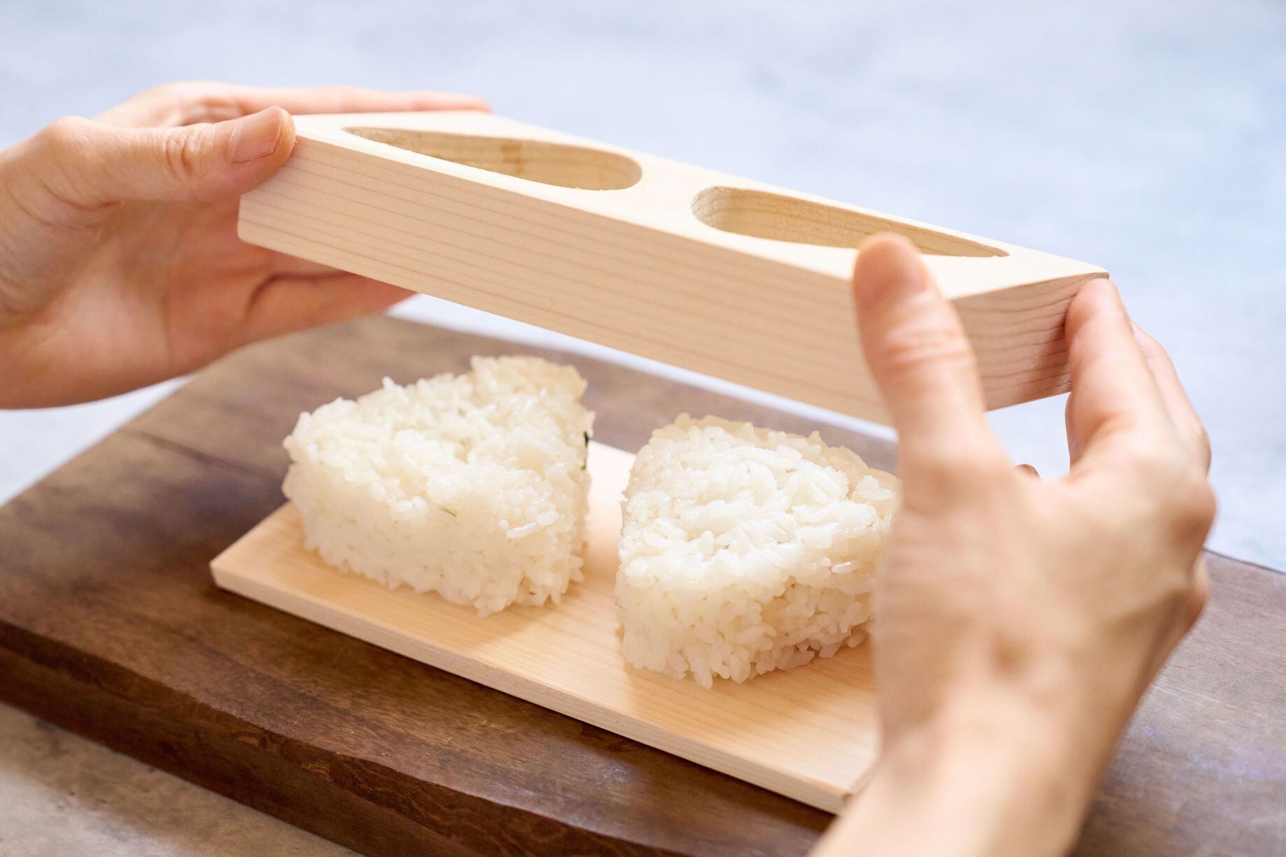 ヒノキの木の型が余分な水分を吸収し、ご飯をより美味しく。また、出来上がったおにぎりはヒノキの香りがほんのり移り、食欲をそそるものに。